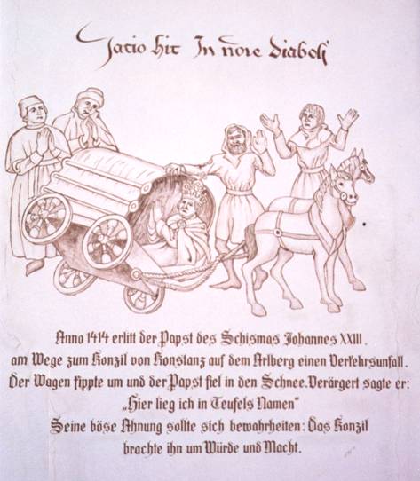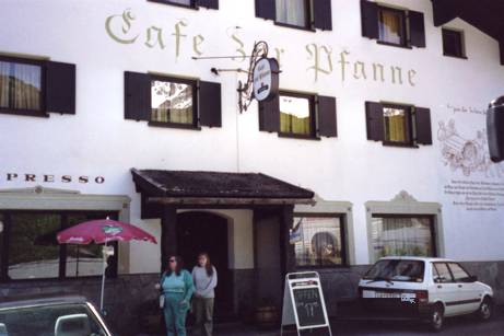 | We stopped for lunch in the Cafe Pfanne. | ![]() | ![]() | The sign painted on the cafe's wall tells the story of the Antipope John XXIII's cart's turning over and his falling into the snow at this location in 1414 on his way to the Council of Constance. |